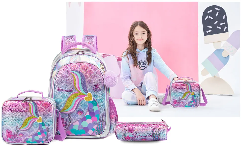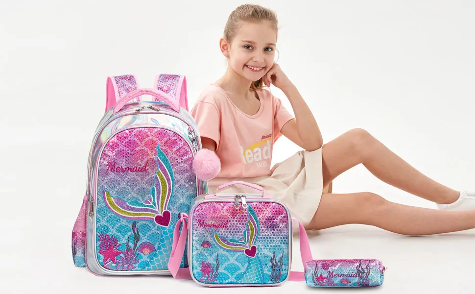 • 🧜‍♀️[Mermaid Backpack Capacity] Conjunto de mochila Mermaid School incluindo mochila adolescente, lancheira, estojo e 1 pingente. A mochila contém 1 grande compartimento principal com zíper duplo com bolso para laptop para fichários; laptops; livros; etc.1 bolso frontal para blocos de notas; óculos; etc.,2 bolsos laterais para garrafas de água ou guarda-chuvas dobráveis;