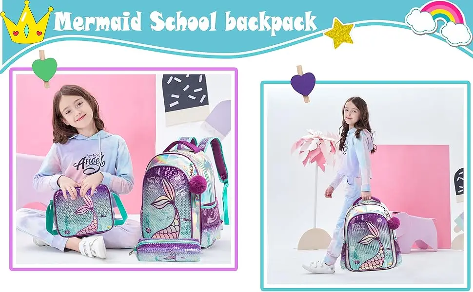 • 🧜‍♀️[Girls Backpacks Wide Application] Esta bolsa escolar sereia é boa ideal para várias ocasiões como escola, viagens, caminhadas e camping, turismo. Este bonito toddlers bookbag é a melhor escolha para voltar para a escola, Natal, Ano Novo, presentes de aniversário.