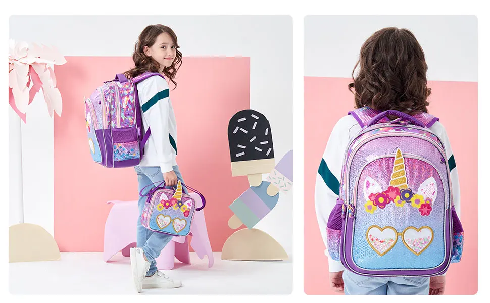 Mochila Lantejoula com lancheira para alunos do ensino fundamental, mochilas escolares meninas, 16